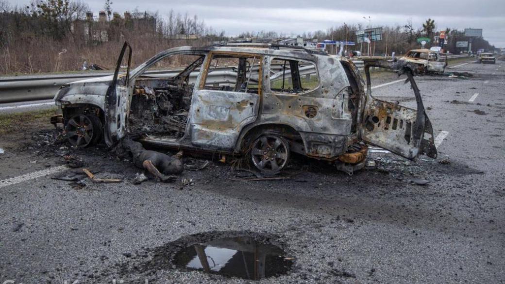 На дороге лежат тела. Кто эти люди и как они умерли, неизвестно. Правда, некоторых погибших уже узнали. Среди них –  семейная пара, которых убили оккупанты и оставили на дороге. Их расстрелянная машина стоит возле сгоревшей АЗС. Тела принадлежат Максиму Иовенко и его супруге Ксении. Они ехали в колонне из десяти гражданских машин, которые пытались убежать от оккупантов и добраться до столицы. В автомобиле также был их шестилетний сын и мать друзей. Они выжили, но сильно травмированы.