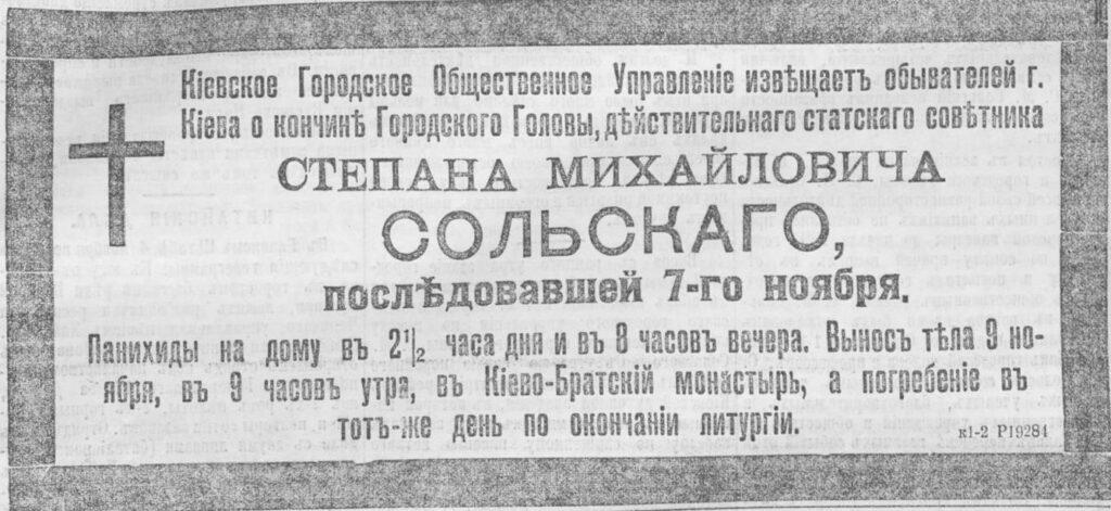 Но впоследствии все наладилось, Сольского переизбирали на должность мэра Киева аж 3 раза. Такого доверия горожане не выказывали ни к кому. Даже умер Степан Михайлович выполняя свои служебные обязательства. В этот день в городской думе поднимался вопрос о благоустройстве Лукьяновского кладбища. Сольский активно дискутировал на эту тему, а также пытался аргументировать, почему на это следует выделить средства. Именно во время заседания городской думы у него случился сердечный приступ.