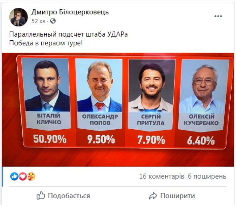 Действующий глава Киева Виталий Кличко по предварительным данным побеждает в первом туре выборов. Об этом поспешил сообщить советник мэра Дмитрий Белоцерковец. Согласно предварительным подсчетам у Виталия Кличко – 50,9% голосов жителей Киева, пишет kyivyes.com.ua.